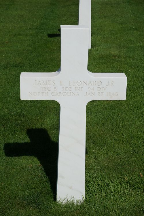 T/5 James E. Leonard Jr. was a decorator and window dresser before he enlisted at Camp Croft, South Carolina on 4 December 1942.Source of information: Peter Schouteten, www.abmc.gov, www.wwiimemorial.com, www.archives.gov – WWII Enlistment Record, www.ancestry.com - Headstone and Interment Record / North Carolina Birth Indexes / 1940 Census / U.S. WWII Draft Cards Young Men, http://www.94thinfdiv.com