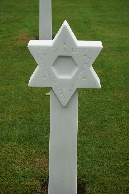 S/Sgt Sidney J. Levine attended New Utrecht High School and was employed by the Crucible Steel Corporation before he enlisted at Camp Upton, New York on 19 May 1944. He was sent overseas in November 1944.Source of information: Peter Schouteten, www.abmc.gov, www.wwiimemorial.com, www.archives.gov – WWII Enlistment Record, www.ancestry.com - Headstone and Interment Record / U.S. WWII Draft Cards Young Men / 1930 Census, www.fold3.com – 26th Infantry Division, www.newspapers.com – Daily News 22 February 1945