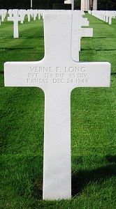 Per Lt Col Aubrey Akin, his batallion commander, in a letter to the Long family: "On the day Verne gave his life for his country he was participating with his company in their assigned mission of clearing a certain sector of Saarlautern - Roden, Germany of the enemy. In the skirmish that followed it was necessary to fight each house in the sector before the objective was reached. Verne was hit and killed by sniper fire as he ran from one building to another. Our medical aid man was at his side within a few moment after he fell but discovered that Verne died instantly."