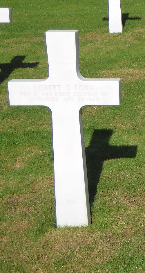 T/5 Robert J. Loya worked on a farm before he joined the Regular Army in Rutland, Vermont on 18 October 1941. He was sent overseas in November 1943.He died of injuries to his stomach, sustained in a vehicle accident.