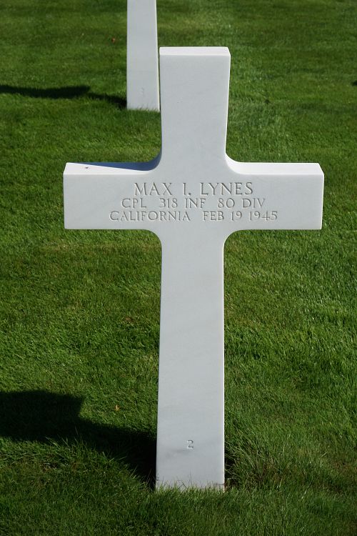 Cpl Max I. Lynes attended high school for four years, was a clerk employed by the Santa Fe Railway Co. before he volunteered for the Army of the United States in Los Angeles, California on 17 December 1941.He was killed by artillery shell fragments in the thorax and head.