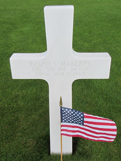 Ralph I. Maberry attended high school for 4 years and worked on a general farm before he enlisted in Camp Dodge Herrold, Iowa on 28 January 1943.Source of information: Peter Schouteten, www.abmc.gov, www.wwiimemorial.com, www.archives.gov – WWII Enlistment Record, www.ancestry.com - Headstone and Interment Record / WWII Bonus Case Files / 1920 Census, http://www.94thinfdiv.com, www.findagrave.com