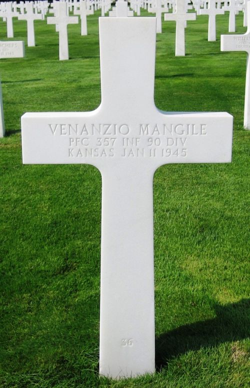 Pfc Venanzio C. Mangile was a miner before he enlisted at Fort Leavenworth, Kansas on 3 September 1943.Source of information: Peter Schouteten, www.abmc.gov, www.wwiimemorial.com, www.archives.gov - WWII Enlistment Record, www.ancestry.com - Headstone and Interment Record / U.S. WWII Draft Cards Young Men / Missouri Western District Naturalization Index, http://www.usarmydatadepot.com/composition_de_la_357th_inf_reg_de_la_90th_id_6424.htm