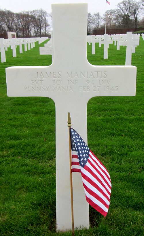 Pvt James Maniatis attended high school for 2 years before he enlisted in Pittsburgh, Pennsylvania on 3 August 1944.Source of information: Peter Schouteten, www.abmc.gov, www.wwiimemorial.com, www.archives.gov - WWII Enlistment Record, www.ancestry.com - Headstone and Interment Record / U.S. WWII Draft Cards Young Men / 1930 Census, http://www.94thinfdiv.com
