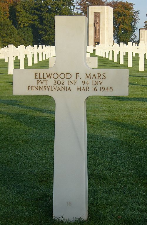Pvt Ellwood F. Mars enlisted in Philadelphia, Pennsylvania, on 10 July 1944.Source of information: Peter Schouteten, www.abmc.gov, www.wwiimemorial.com, www.archives.gov – WWII Enlistment Record, www.ancestry.com - Headstone and Interment Record, http://www.94thinfdiv.com, www.findagrave.com