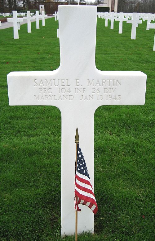 Pfc Samuel E. Martin attended high school for four years and worked in an aircraft plant before he enlisted in Baltimore, Maryland on 16 February 1943.He was killed to the effects of artillery shell fragments and a skull fracture with brain damage.