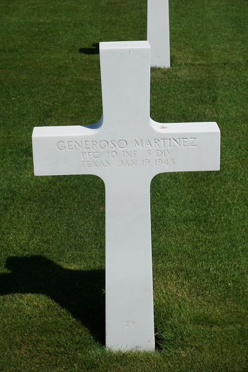 Pfc Generoso Martinez enlisted at Fort Sam, Texas on 22 December 1943.Source of information: Leo Minne, www.abmc.gov, www.wwiimemorial.com, www.archives.gov - WWII Enlistment Record, www.ancestry.com - 1930 Census /U.S. Headstone and Interment Record for U.S. Military Cemeteries on Foreign Soil, A footsoldier for Patton / Michael C. Bilder James G. Bilder, The 5th infantry Division in the ETO
