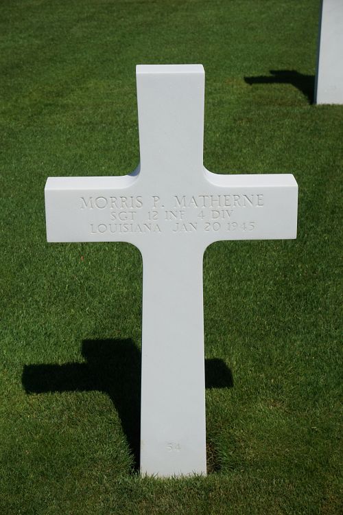 Sgt Morris P. Matherne attended high school for four years before he enlisted at Jacksonville Army Air Field, Florida on 19 February 1941.Source of information: Peter Schouteten, Company's / 4ID After Action Reports, www.abmc.gov, www.wwiimemorial.com, www.archives.gov - WWII Enlistment Record, www.ancestry.com - Headstone and Interment record / 1930 Census / U.S. WWII Draft Cards Young Men, www.findagrave.com - Sebastiaan