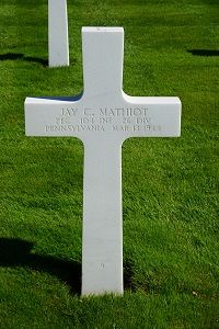 Pfc Jay C. Mathiot attended high school for two years and was employed at the Armstrong Cork Company before he enlisted in Harrisburg, Pennsylvania on 11 February 1943. He was sent overseas in May 1944.