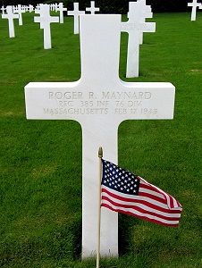 Pfc Roger R. Maynard attended high school for 4 years and was was employed as manager of the Thom McAn Shoe Store in West Warwick. Before working for that firm he was employed at the stores of Joseph Nadeau and of Armand Brodeur in this city before he enlisted at Fort Devens, Massachusetts on 12 April 1944. He trained at Camp Croft, South Carolina, Camp McCoy, Wisconsin and Camp Myles Standish, Massachusetts. He left for overseas in November 1944 and served in England, France, Belgium and Luxembourg.Source of information: André Koch, Carla Mans, www.abmc.gov, www.wwiimemorial.com, www.archives.gov – WWII Enlistment Record, www.ancestry.com - 1920/1930/1940 Census / Headstone and Interment Record / U.S. WWII Draft Cards Young Men, Daniel Sheehan Fall River Main Library - Fall River Herald News 8 March 1945