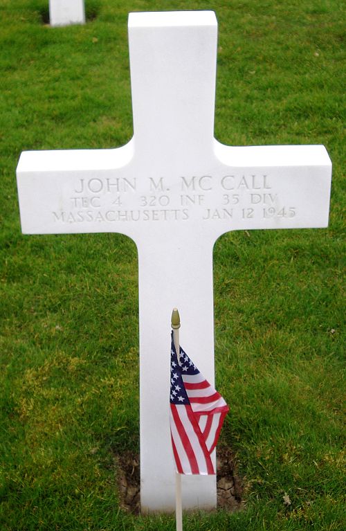 T/4 John M. McCall graduated from St. Patrick's High School in 1943 and was clerk to the fire chief at the Watertown Arsenal before he enlisted in Boston, Massachusetts on 4 June 1943. He was sent overseas in September 1944.Source of information: Peter Scouteten, www.abmc.gov, www.wwiimemorial.com - Dolores McCall, www.archives.gov - WWII Enlistment Record, www.ancestry.com - Headstone and Interment Record / U.S. WWII Draft Cards Young Men / 1930 Census, After Action Report 35th Infantry Division, www.newspapers.com - The Boston Globe, Boston, Massachusetts 26/28 January 1945