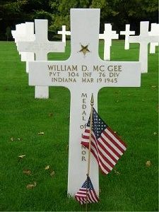 Pvt William D. McGee graduated from Arsenal Technical High School and worked for the Kroger Grocery Company before he enlisted in Indianapolis, Indiana on 11 December 1942. He arrived in England on 23 February 1945.He was posthumously awarded the Medal of Honor. The citation stated: “Pvt William D. McGee served as medical aid man, he made a night crossing of the Moselle river with troops endeavoring to capture the town of Mulheim. The enemy had retreated in the sector where the assault boats landed, but had left the shore heavily strewn with anti-personnel mines. Two men of the first wave attempted to work their way forward, detonated mines which wounded them seriously, leaving them bleeding and in great pain beyond the reach of their comrades. Entirely on his own initiative Pvt McGee entered the minefield, brought out one of the injured to comparative safety, and had returned to rescue the second victim when the stepped on a mine and was severely wounded in the resulting explosion. Although suffering intensely and bleeding profusely, he shouted orders that none of his comrades was to risk his his life by entering the the death sown field to render first aid that might have saved his life. In making the supreme sacrifice, he demonstrated a concern for the well being of his fellow soldiers that transcended all considerations for his own safety and a gallantry in keeping with the highest traditions of the military service".
