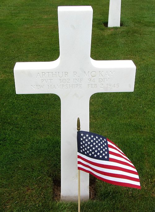 Pvt Arthur R. McKay attended high school for 4 years and was a driver before he enlisted in Manchester, New Hampshire on 14 July 1944.Source of information: Peter Schouteten, www.abmc.gov, www.wwiimemorial.com, www.archives.gov – WWII Enlistment Record, www.ancestry.com - Headstone and Interment Record / 1930 Census / Maine Birth Records / New Hampshire Marriage and Divorce Records, http://www.94thinfdiv.com, www.findagrave.com – Russ Pickett
