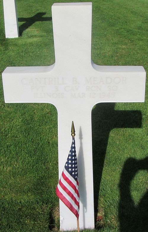 Pvt Cantrill B. Meador enlisted in May 1944.Source of information: Peter Schouteten, www.abmc.gov, www.wwiimemorial.com, www.ancestry.com - Headstone and Interment Record / U.S. WWII Draft Cards Young Men / Edith Salmons Family Tree, www.findagrave.com, www.newspapers.com - Journal Gazette Illinois 30 March 1945/The Park City Daily News 6 April 1945