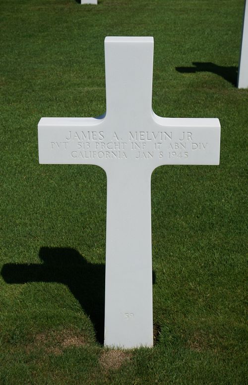 James A. Melvin Jr. was a clerk before he volunteered for the Army of the United States in Los Angeles, California on 15 July 1942.Pvt Melvin was first buried at the Temporary American Military Cemetery of Grand Failly, France.
