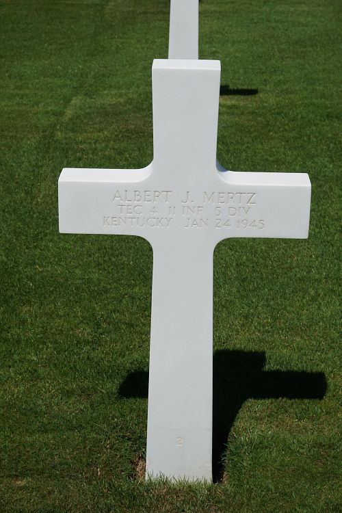 T/4 Albert J. Mertz worked in a metal production factory before he enlisted in Louisville, Kentucky on 17 September 1942.Source of information: Leo Minne, www.abmc.gov, www.wwiimemorial.com, www.archives.gov - WWII Enlistment Record, www.ancestry.com - Headstone and Interment Record / 1920/1930/1940 Census / Wade Manning Family Tree, A footsoldier for Patton - Michael C. Bilder and James G. Bilder, The 5th Infantry Division in the ETO