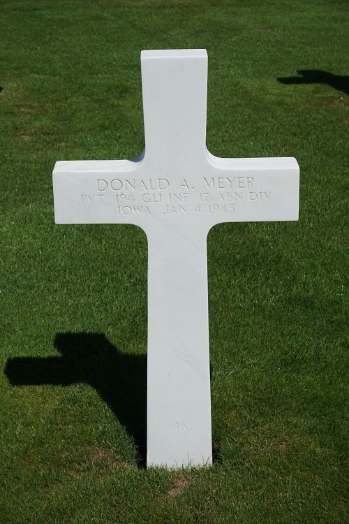 Pvt Donald A. Meyer was employed at the Rock Island Arsenal before he enlisted at Camp Dodge, Iowa on 12 April 1943. He was sent overseas in August 1944.He was married to Evalyn Benshoof on 28 October 1943.