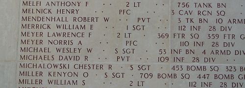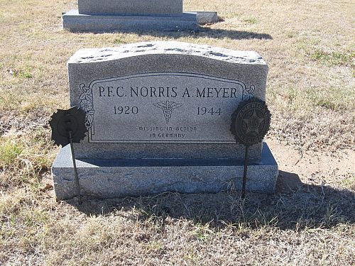 Pfc Norris A. Meyer was officially declared dead one year and one day after he was reported missing in action. At that time his unit was fighting in the vicinity of Bastogne.He is remembered at the Great Bend Cemetery in Great Bend, Barton County, Kansas.
