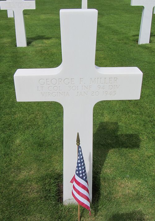 After the barrage by the 301st Field Artillery Battalion, Company A again moved out onto the deadly slope, only to face the same intensive enemy fire. Every weapon available to the battalion was used without results. Finally, German artillery fire began to fall among the attacking Americans. Colonel Miller came forward to see what could be done to get his battalion moving. Concerned over the plight of Company B as well as his exposed men on the open slope, he moved into enemy artillery range and was cut down by a burst of fire and was killed almost immediately.Lt Col George F. Miller is remembered at the Mount Hebron Cemetery in Winchester, Virginia.