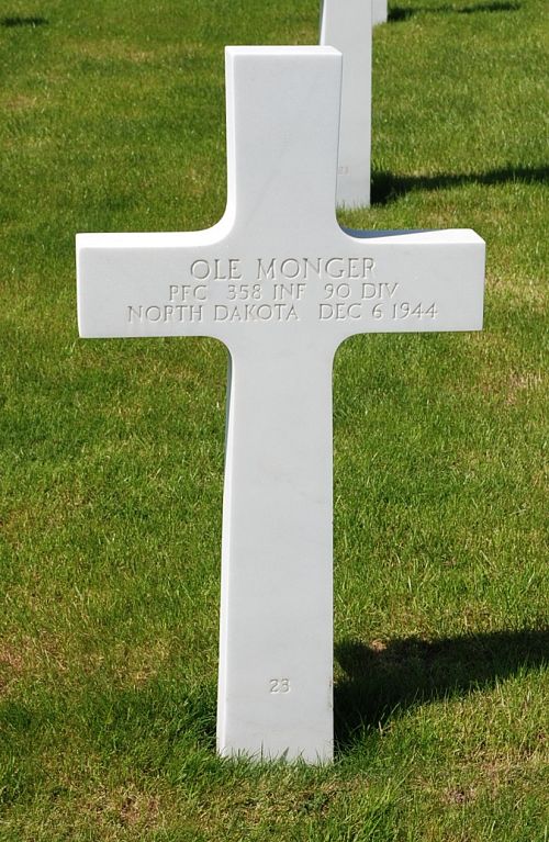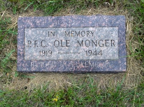 Pfc Ole Monger is remembered at the Hauge Cemetery in Alamo, Williams County, North Dakota.Source of information: Peter Schouteten, www.abmc.gov, www.wwiimemorial.com - John M. Monger, www.ancestry.com - Headstone and Interment Record / 1930/1940 Census, www.findagrave.com - Herb Schwede