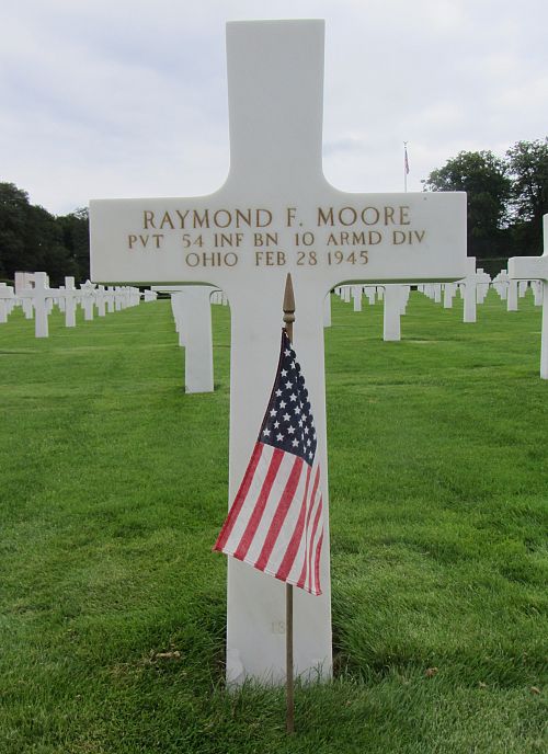 Pvt Raymond F. Moore attended high school for four years before he enlisted at Fort Hayes, Ohio on 11 March 1943.He was killed by aerial bomb fragments to the chest.