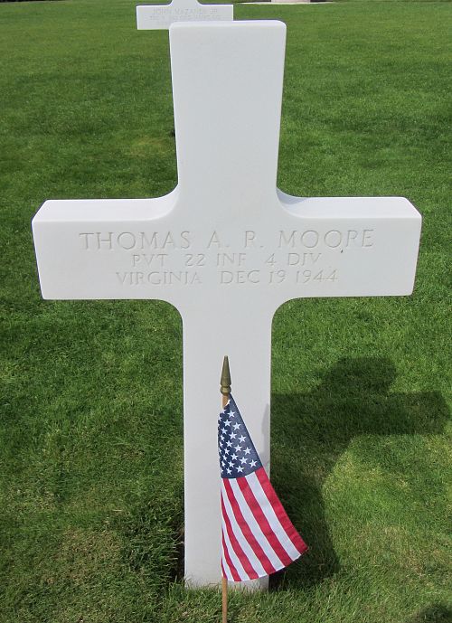 Pvt Thomas A. R. Moore graduated from Benedictine High School and was a compositor and typesetter before he enlisted in Richmond, Virginia on 6 May 1943. He was sent overseas in June 1944.Source of information: Peter Schouteten, Debbie Holloman, Company's 4ID After Action Reports, www.abmc.gov, www.wwiimemorial.com, www.archives.gov - WWII Enlistment Record, www.ancestry.com - U.S. WWII Draft Cards Young Men