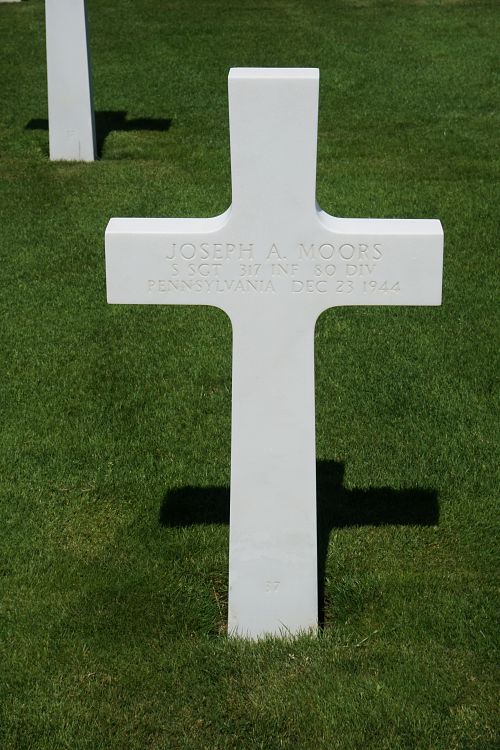 S/Sgt Joseph A. Moors studied engineering at the Drexel Institute in Philadelphia and was employed by the Hosering Mill, producing knit goods.Source of information: Leo Minne, www.abmc.gov, www.wwiimemorial.com, www.ancestry.com – 1930/1940 Census / U.S. Headstone and Interment Record / U.S. Draft Cards Young Men / Pennsylvania Veteran Compensation Application, www.80thdivision.com