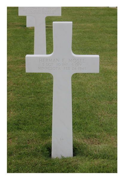 S/Sgt Herman E. Mosel was drafted on 16 October 1940.Source of information: Leo Minne, www.abmc.gov, www.wwiimemorial.com, www.archives.gov - WWII Enlistment Record, www.ancestry.com - Headstone and Interment Record / 1920/1930/1940 Census / Boucher Family Tree / Minnesota Birth Index / WWII Draft Cards Young Men, A footsoldier for Patton - Michael C. Bilder and James G. Bilder, The 5th Infantry Division in the ETO