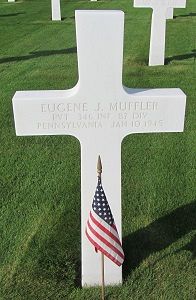 Pvt Eugene J. Muffler attended high school for four years and was employed at the Harwood plant of the Pennsylvania Power and Light Company before he enlisted in Wilkes Barre, Pennsylvania on 16 September 1942.He was first buried at the Temporary American Military Cemetery in Grand Failly, France.