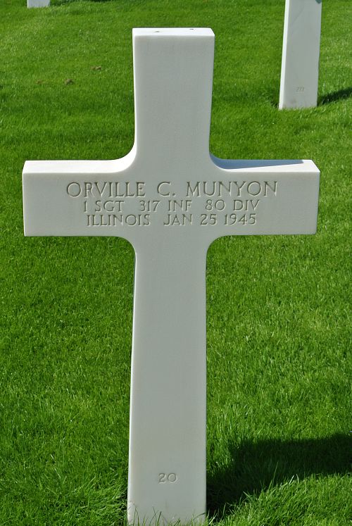 1st Sgt Orville C. Munyon worked on a WPA project before he enlisted in Chicago, Illinois on 31 January 1941.Source of information: Leo Minne, www.abmc.gov, www.wwiimemorial.com, www.ancestry.com – 1930/1940/Census / U.S. Headstone and Interment Record / U.S. Draft Cards Young Men / Bishop – Munyon Family Tree, www.80thdivision.com