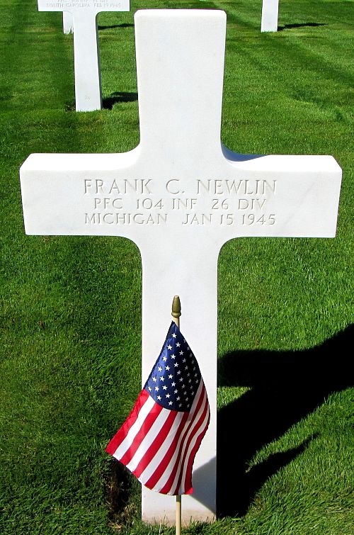 Pfc Frank C. Newlin was employed by the Dow Chemical in Ludington before he enlisted on 6 October 1941. He was sent overseas early in 1943.