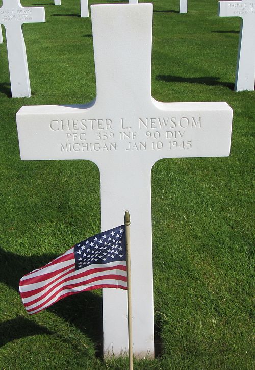 Pfc Chester L. Newsom was a clerk in a headquarters before he enlisted at Fort Custer, Michigan on 7 January 1942.He had been wounded on 9 January and died 10 January in a field hospital in Luxembourg.
