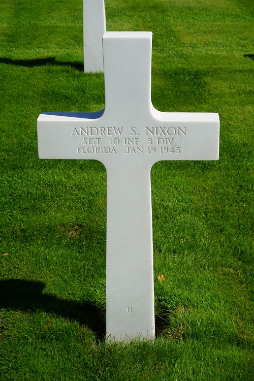 Sgt Andrew S. Nixon worked in a company that produced furnishing utilities before he enlisted at Fort McPherson, Atlanta, Georgia on 19 May 1945.Source of information: Leo Minne, www.abmc.gov, www.wwiimemorial.com, www.archives.gov - WWII Enlistment Record, www.ancestry.com - 1920/1940 Census / U.S. Headstone and Interment Record for U.S. Military Cemeteries on Foreign Soil 1942-1949, A footsoldier for Patton / Michael C. Bilder james G. Bilder, The 5th infantry Division in the ETO