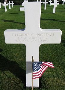 S/Sgt Clemens G. Noldau was a manager before he enlisted at Fort Benjamin Harrison, Indiana on 10 February 1941.He was awarded the Distinguished Service Cross posthumously. The citation cited: In the vicinity of Diekirch, Luxembourg, assaulting elements were halted by intense enemy fire. Sgt Noldau, with complete disregard for his own safety crawled forward over exposed terrain towards the enemy position to give artillery fire directions, and while advancing was killed by enemy fire. His conspicuous heroism lives on as an inspiration to his comrades. The fearless determination and courageous devotion to duty displayed by Sgt Noldau, at the cost of his life, exemplify the highest traditions of the military forces of the United States and reflect great credit upon himself, the 5th Infantry Division, and the United States Army.