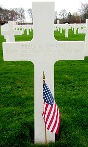 Capt Owens was reported wounded in action on D-Day on 6 June 1944.He was awarded the Silver Star Medal for his action on 7 June 1944. The citation cited: Capt Owens, while his unit was in a defensive position near vital canal locks, took a machine gun and three volunteers to meet and halt enemy troops which were observed crossing open ground toward the concealment of a woods. Capt Owens, standing erect in full view, sprayed the trees with machine gun fire holding the weapon in his hand. The gun jammed twice and the shortage of ammunition forced the group to withdraw. By skillful displacement with only 30 rounds of ammunition, Capt Owens and his group were able to draw the enemy forward until they came in range of the fortified positions on the defensive line and, shortly afterward, the enemy, a battalion in strength, surrendered.
