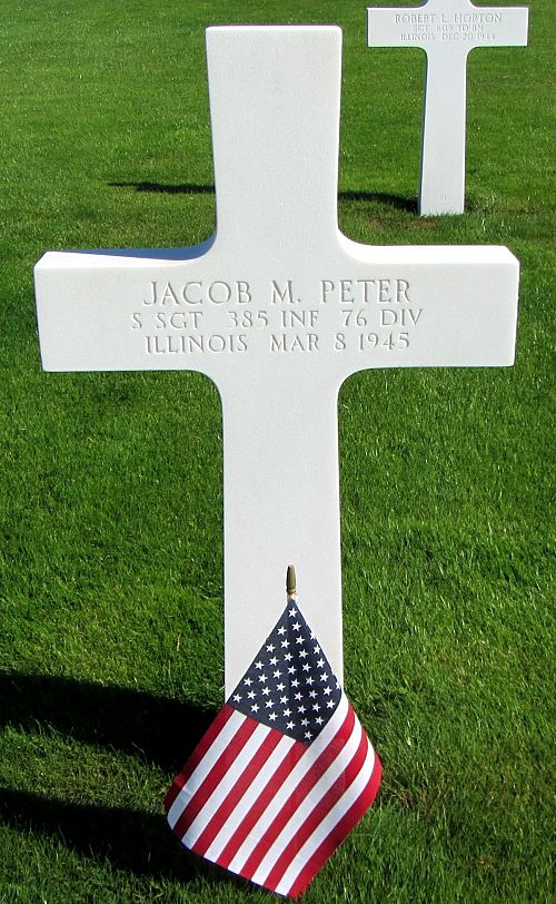 "On 8 March 1945, during an attack against the town of Landscheid, Germany, Sergeant Peter's Platoon was cut off and encircled by the enemy. Defending the left flank of the position with eleven men he successfully repelled repeated enemy counterattacks for seven hours, inspiring and encouraging his man by his bold, fearless leadership. Disregarding his own safety he continually exposed himself to enemy fire, and on one occasion he braved withering fire to drag a wounded comrade to safety. Sergeant Peter was killed while driving off an enemy tank with rifle and grenade fire."
