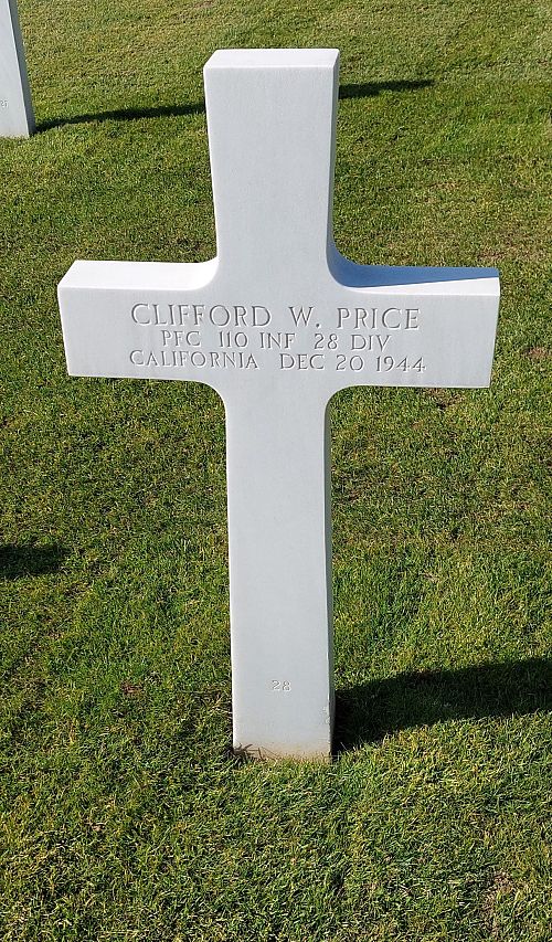 Pfc Clifford W. Price was born on a farm in Manchester, South Dakota. In the 1920's the family moved to Madison South Dakota where he graduated from high school and attended college for 2 years.He married Ethel Grace McBride in 1936. They moved to California where he worked as a carpenter.