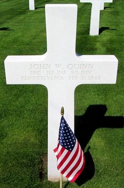Pfc John W. Quinn attended high school for one year and was a mechanic before he enlisted in Philadelphia, Pennsylvania on 23 September 1942.Source of information: Leo Minne, www.abmc.gov, www.wwiimemorial.com, www.ancestry.com - 1930/1940 Census / Headstone and Interment Record / Family Tree, www.80thdivision.com