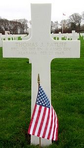 Pfc Thomas J. Ratliff attended high school for three years and was a fireman at the Selma Fire Department before he enlisted at Fort McPherson Atlanta, Georgia on 24 February 1944.Source of information: Peter Schouteten, www.abmc.gov, www.wwiimemorial.com, www.archives.gov – WWII Enlistment Record, www.ancestry.com - Headstone and Interment Record / U.S. WWII Draft Cards Young Men, www.findagrave.com, www.newspapers.com – The Selma Times Journal 14 March 1945, www.6tharmoreddivision.com, www.super6th.org