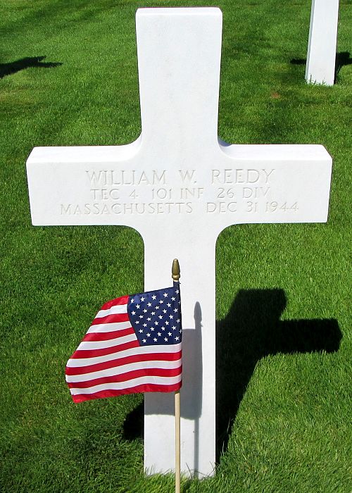 T/4 William W. Reedy attended high school for four years and was a retail manager at the Hyde’s Square Wine Company Inc. before he volunteered for the Army of the United States at Fort Devens, Massachusetts on 4 February 1943.He was killed by artillery shell fragments.