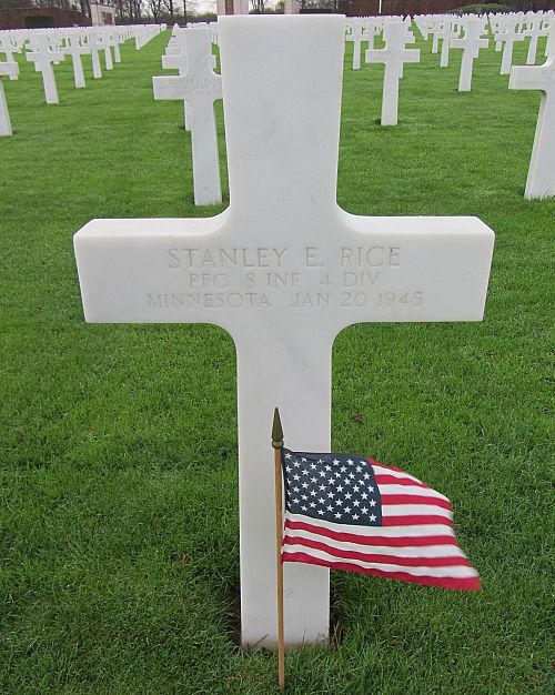 Pfc Stanley E. Rice attended high school for one year and worked on a farm before he enlisted at Fort Snelling, Minnesota on 7 May 1944.He is remembered at the Greenwood Cemetery in Bemidji, Beltrami County, Minnesota.