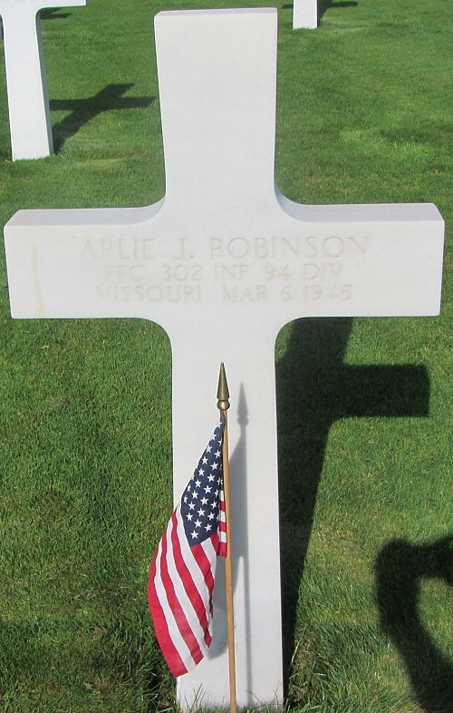 Pfc Arlie J. Robinson enlisted at Jefferson Barracks, Missouri on 23 November 1942. He was sent overseas in July, 1944.Source of information: Peter Schouteten, www.abmc.gov, www.wwiimemorial.com, www.archives.gov - WWII Enlistment Record, www.ancestry.com - Headstone and Interment Record / 1940 Census / U.S. Social Security Death Index / U.S. WWII Draft Cards Young Men, http://www.94thinfdiv.com