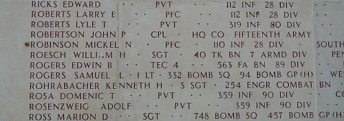 Pfc Mickel N. Robinson attended high school for four years and worked on a farm before he enlisted at Fort Jackson Columbia, South Carolina on 12 February 1943.Source of information: Peter Schouteten, www.abmc.gov, www.wwiimemorial.com, www.archives.gov - WWII Enlistment Record, www.ancestry.com, www.findagrave.com