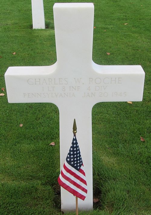 1st Lt Charles W. Roche graduated from Chester High School and worked in a shipbuilding company before he joined the Regular Army in Philadelphia, Pennsylvania on 15 October 1940. He first served in the Panama Canal Zone and in Central America. When the war broke out, he was transferred to the U.S. and was sent to Officers' Candidate School at Fort Benning, Georgia, where he was commissioned in March 1942. After advanced infantry training from 9 May to 9 August 1944, he was promoted to first lieutenant and sent overseas on 17 September 1944.His brother Arthur was taken prisoner on 18 December 1944 in Belgium.
