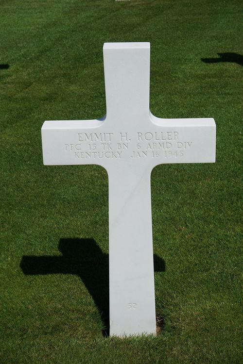 Pfc Emmit H. Roller was a semi-skilled cement and concrete finisher before he enlisted in Louisville, Kentucky on 9 April 1942.He was first buried at the Temporary American Military Cemetery in Grand Failly, France.