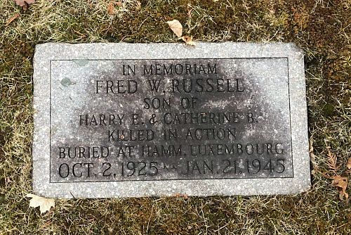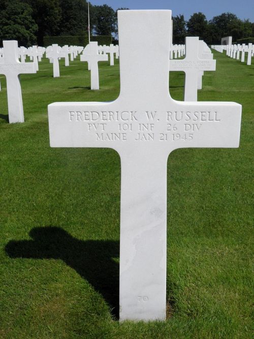Pvt Frederick W. Russell attended high school for four years before he enlisted in Portland, Maine on 13 November 1943.He was killed by artillery shell fragments to his buttock, hip and chest.