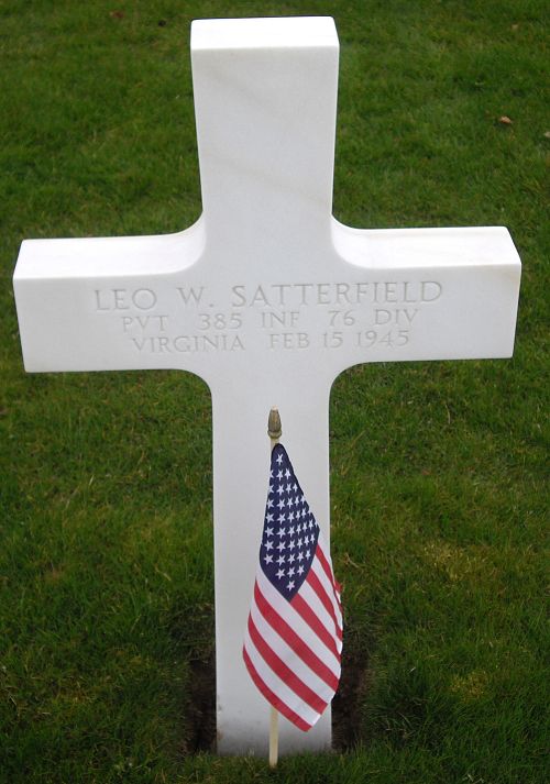 Pvt Leo W. Satterfield enlisted at Fort George G. Meade, Maryland on 28 April 1944. He was sent overseas in November 1944.He was awarded the Distinguished Service Cross posthumously. The citation cited:For extraordinary heroism in connection with military operations against an armed enenmy in Germany. During an attack against Siegfried Line positions near Irrel, Germany, on 15 February 1945, Pvt Satterfield boldly led his squad in a succesful assault upon enemy machine gun position which had been harrassing his platoon. When fire from a pill box impeded the advance, he volunteered to go forward and reduce the position. He deliberatly exposed himself to draw fire and pinpoint the enemy location, then advanced from the the flank and reduced the pill box with grenade and rifle fire. Pvt Satterfield was killed by artillery fire but his heroism lives on as an inspiration to his comrades. His courageous devotion to duty is in keeping with the highest traditions of the Military Service.