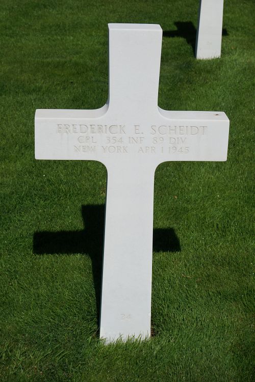 Cpl Frederick E. Scheidt was graduated from Brooklyn Polytechnic Institute and was working for the U.S. Government as a civil engineer.He enlisted in New York City, New York on 10 November 1942. He was selected for the Army Specialized Training Program (A.S.T.P.) and studied at Stanford University.