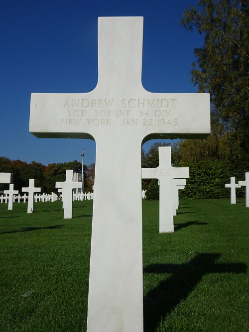 Sgt Andrew Schmidt graduated from Newtown High School and was a checker before he enlisted in New York City, New York, on 9 December 1942. He was sent overseas in August 1944.Source of information: Peter Schouteten, www.abmc.gov, www.wwiimemorial.com, www.archives.gov – WWII Enlistment Record, www.ancestry.com - Headstone and Interment Record / 1920 Census, http://www.94thinfdiv.com, www.findagrave.com – Anonymous