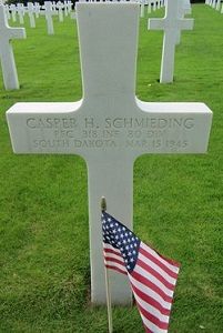 Pfc Casper H. Schmieding was a railroad employee before he enlisted.He was wounded in February 1945 by artillery shell fragments in the buttock and hip. After recovering he rejoined his unit.